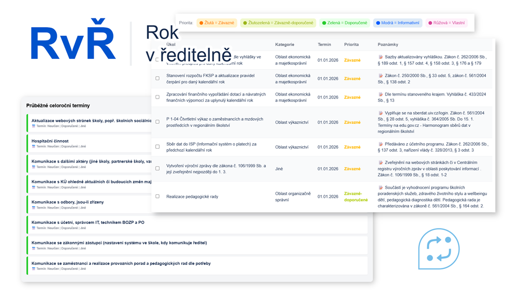 Nový interaktivní a neustále aktualizovaný nástroj je určen nejen pro ředitele, ale také pro zřizovatele škol a školských zařízení. Poskytuje podporu v oblasti administrativní a manažerské práce, která je nezbytnou součástí každodenního chodu školy. Od plánování rozpočtu přes řízení personálu až po zajištění bezpečného a podnětného prostředí pro žáky. Sumarizuje všechny úkoly, na které by měl ředitel školy se svým týmem či zřizovatel školy během celého roku realizovat.